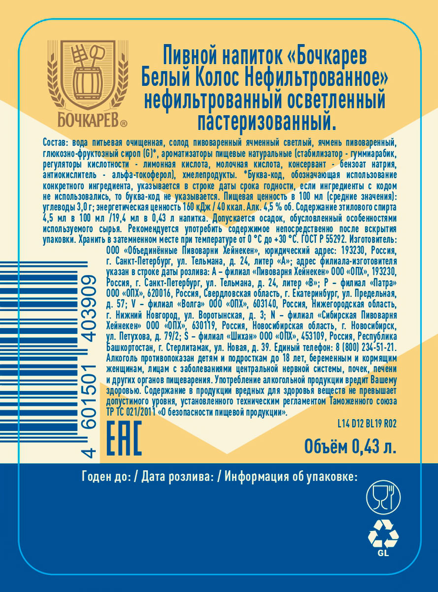 Напиток пивной Бочкарев Белый Колос светлое нефильтрованное пастеризованное ст 0,43 л