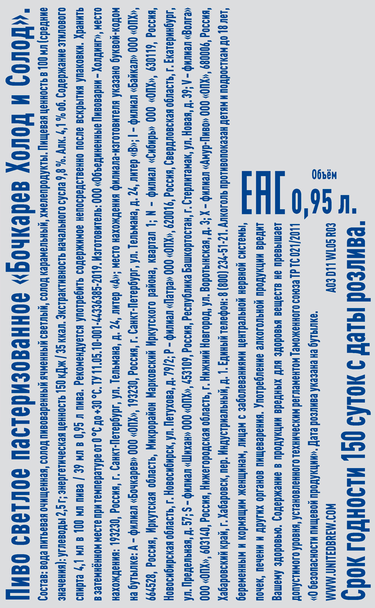 Пиво Бочкарев Холод и Солод светлое пастеризованное 0,95 л