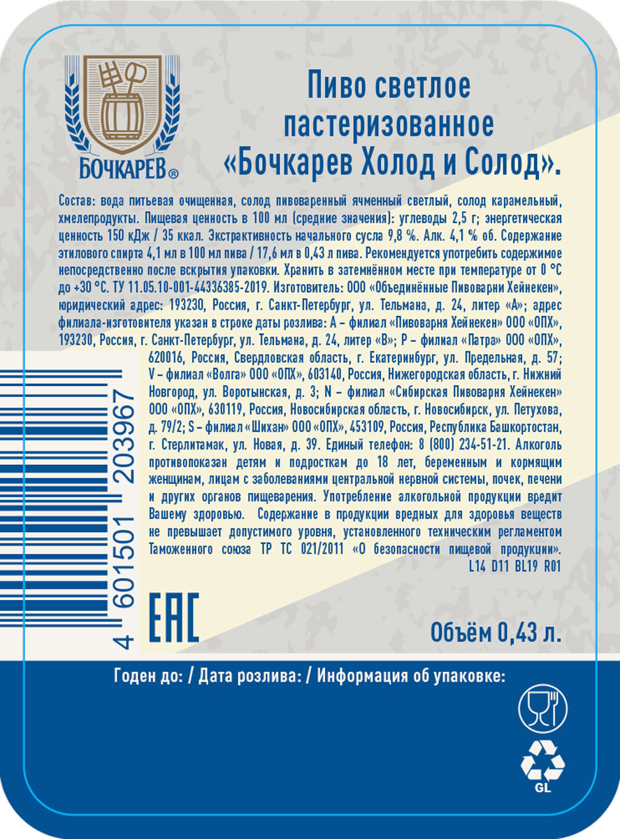 Пиво Бочкарев Холод и Солод светлое ст 0,43 л