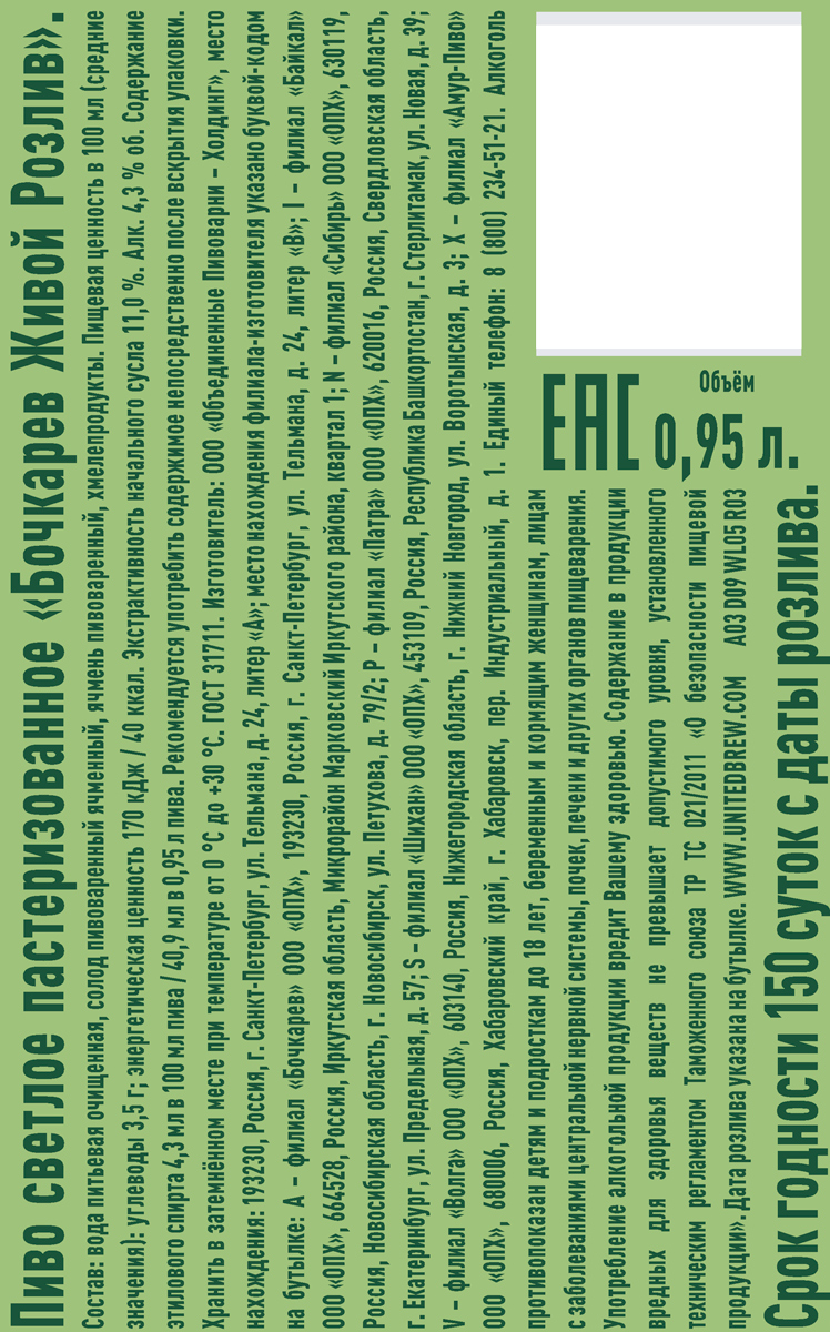 Пиво Бочкарев Живой Розлив светлое пастеризованное пэт 0,95 л