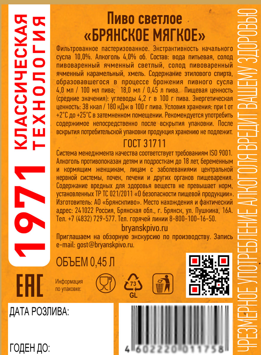 Пиво Брянское Мягкое светлое фильтрованное пастеризованное ст 0,45 л