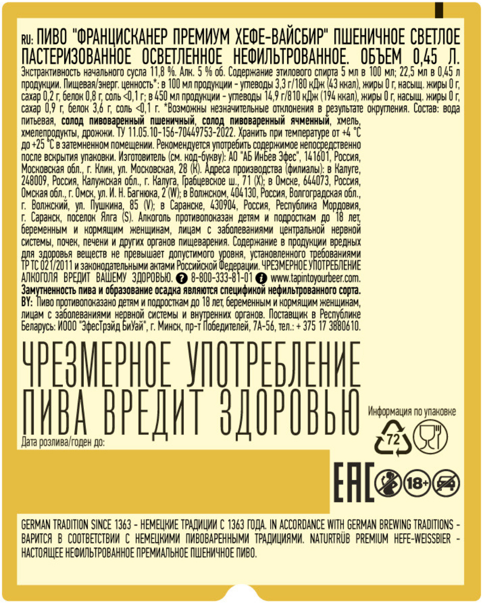 Пиво Францисканер Премиум Хефе Вайсбир пшеничное светлое нефильтрованное пастеризованное ст 0,45 л