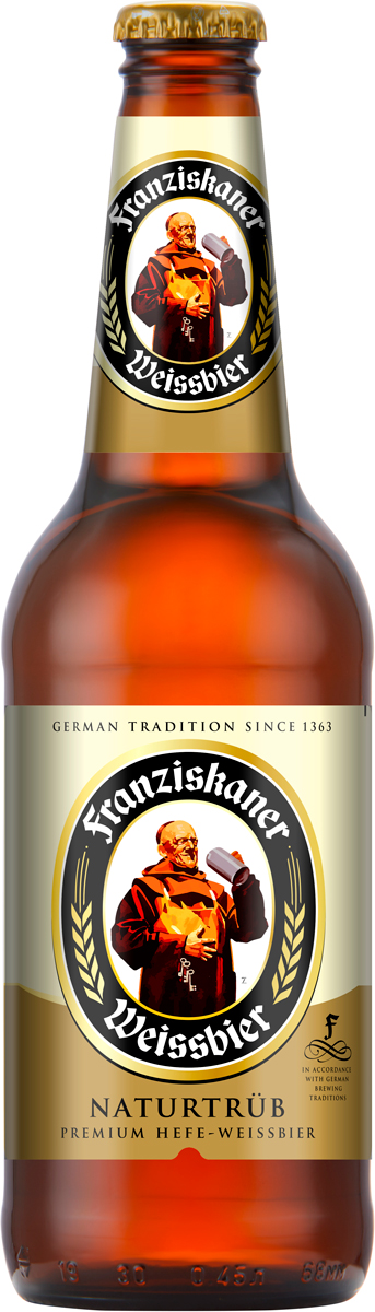 Franziskaner — нефильтрованное пшеничное пиво верхового брожения золотистого цвета с пышной пеной. Бренд родом из Мюнхена, столицы земли Баварии. Franziskaner Hefe-Weiss — эталон пшеничного пива. Отличный выбор для тех, кто ценит качество, проверенное временем, и хочет побаловать себя. Идеально подходит к блюдам из белой рыбы, кролика, птицы, сырам. Фирменное отличие – особая раса дрожжей и высокое содержание пшеничного солода. Вкус выделяет изящная хмелевая горчинка и легкие фруктовые ноты с уникальным хлебным послевкусием.