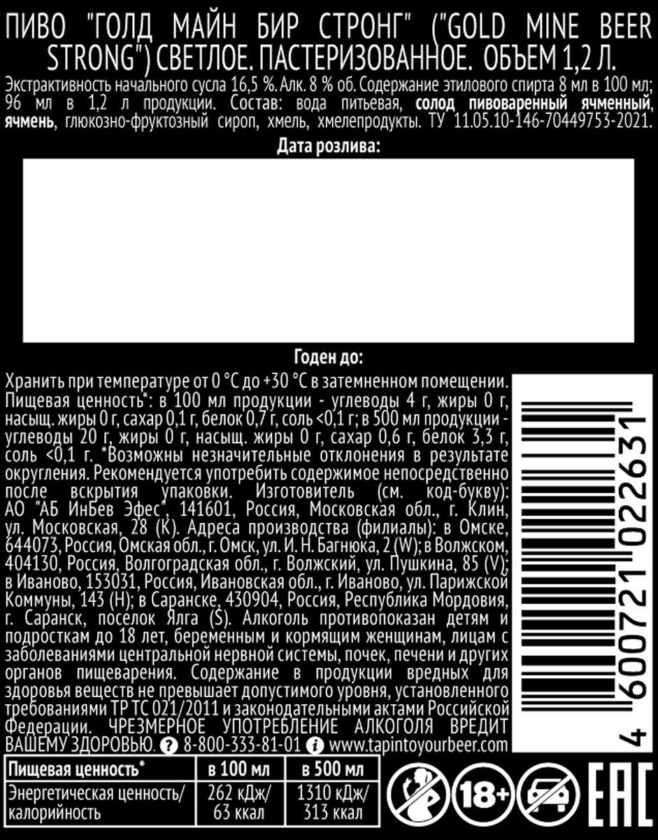 Пиво Голд Майн Бир Стронг светлое пастеризованное 1,15 л