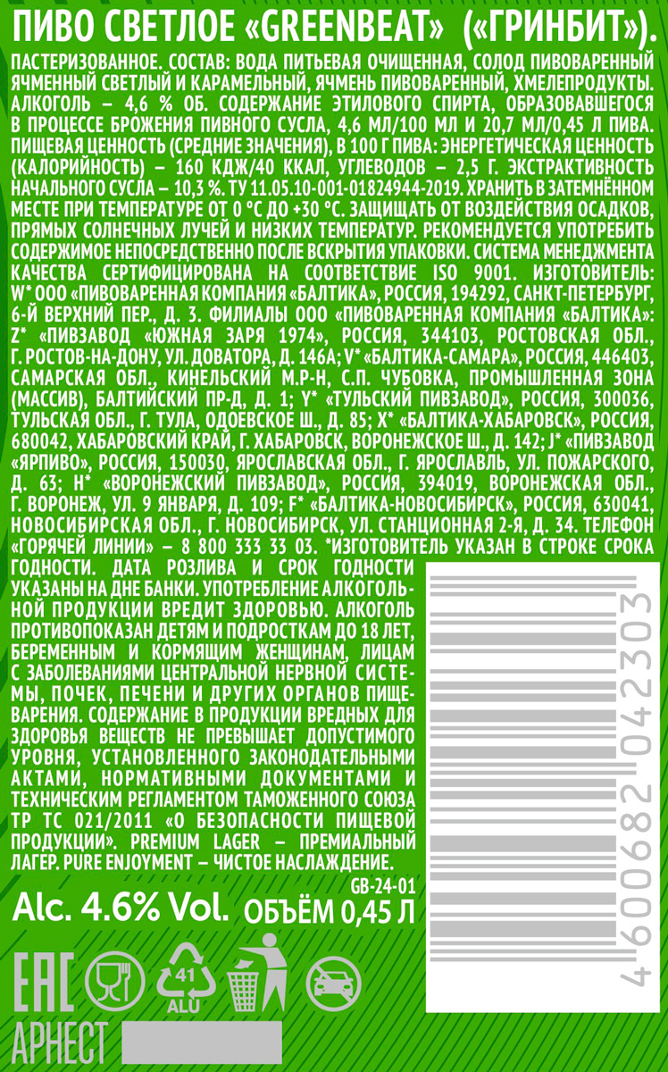 Пиво Гринбит светлое пастеризованное ж/б 0,45 л