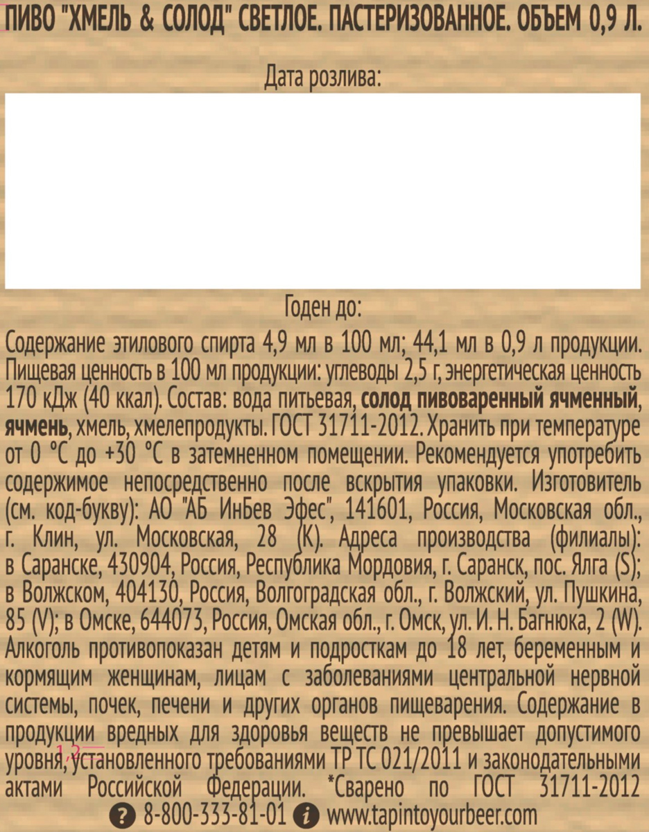 Пиво Хмель и Солод светлое пастеризованное 0,9 л