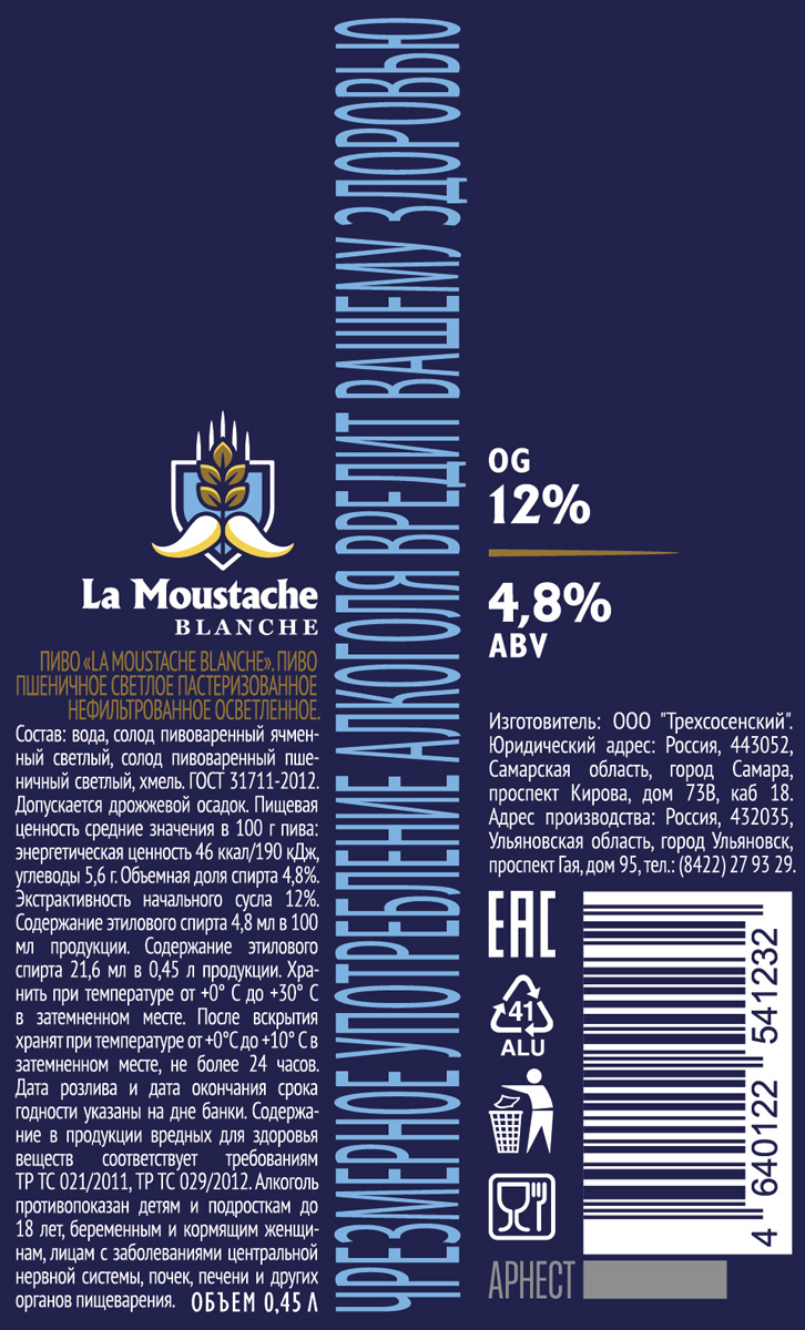La Moustache blanche — нефильтрованное светлое пшеничное пиво, сваренное для настоящих гурманов. Пиво очень мягкое, с едва уловимой горчинкой — его высоко оценят как представители женской, так и мужской аудитории.