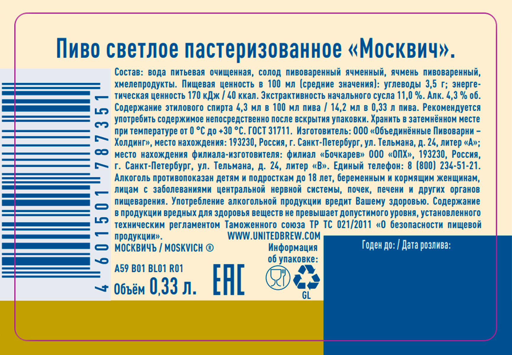 Пиво Москвич светлое пастеризованное ст
