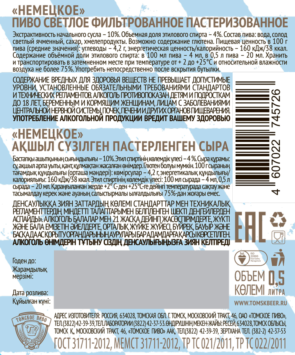 Пиво Немецкое светлое фильтрованное пастеризованное ст 0,5 л