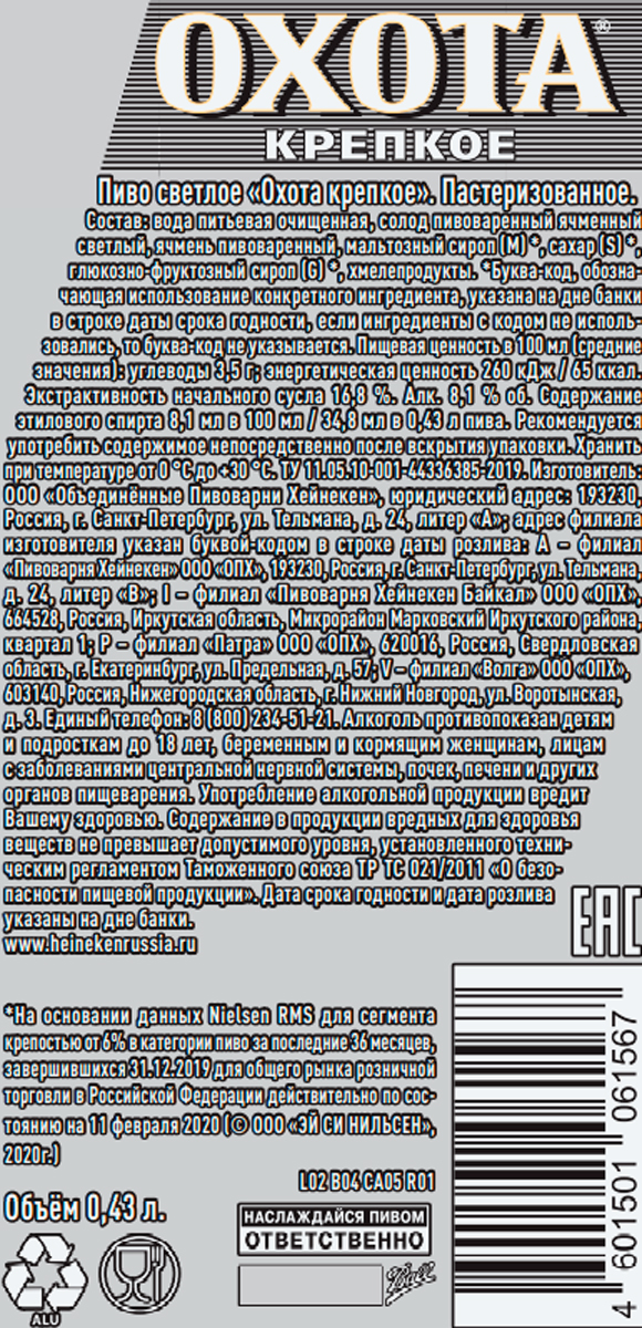 Охота крепкое- выбор сильных! Третьего дня с камрадом решили попить пенного и наш взор пал на сей шедевр пивоваренной промышленности. Стоит упомянуть строгий и лаконичный дизайн упаковки- никаких излишеств. Всё нужное и по делу. О вкусе- мое почтение. С первого глотка ты ощущаешь прилив силы, а со второго начинаешь задумываться об основах мироздания. После третьего глотка этого изумительного пива перед вами уже не стоят вопросы этого мира, т.к. приходит понимание того, что наше существование в нынешнем своем виде осталось далеко позади, и мысли уходят в бескрайние глубины космоса. Нельзя оставить без внимания расслабляющее действие любимого пива. Пьянящий эффект- вне конкуренции. Там где с обычным пивом требуется три, а то и четыре бутылки, тут хватит двух, чтобы напиться до омерзительного самому себе и окружающим состояния. Вы, скорее всего, скажете: "Такое пиво, наверное, очень дорогое! Простым пролетариям это не по карману!" И вы ни на йоту не окажетесь правы, потому что цена у охоты по-настоящему народная, а если вспоминить то, что магазин зачастую предоставляет скидки на данный напиток, то можно и вовсе сказать с уверенностью, что свою вечеринюю "баклашечку" может себе позволить каждый, поэтому с ударом по кошельку полный порядок, т.к. удара как такового и нет. На утро мы с камрадом не ощутили ничего кроме бодрости после крепкого сна и желания начать новый трудовой день. Подводя итог, можно сказать, что охота крепкое действительно можно назвать одним из любимейших сортов пива у россиян и граждан стран ближнего зарубежья, а все перечисленные в этом кратком обзоре достоинства и достижение заслужены не словом, а делом.