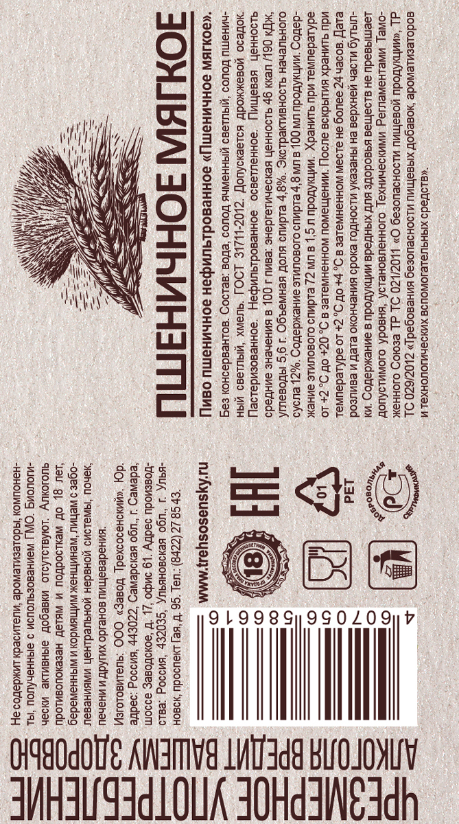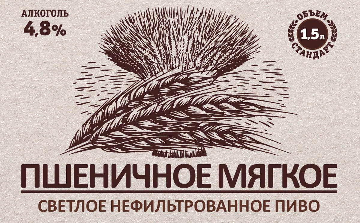 «Пшеничное Мягкое» – светлое нефильтрованное пшеничное пиво с объемным мягким хлебным вкусом и тонким ароматом пшеничного солода. В меру легкое, обладает сбалансированным характером и приятным светло-соломенным цветом истинного пшеничного пива.