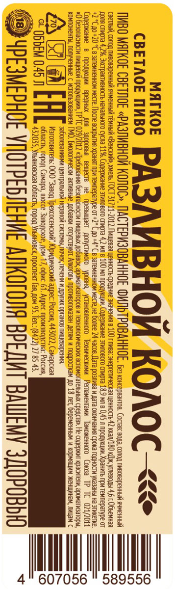 Пиво «Разливной колос» варится на специально отобранных мягких сортах солода с собственной солодовни. Отличается приятным вкусом с легкой хмелевой горчинкой.