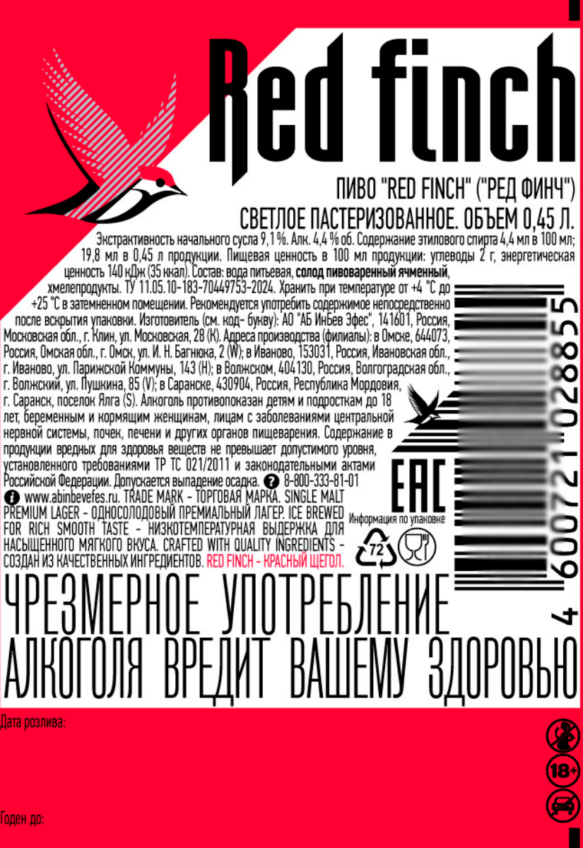 Премиальный лагер, сваренный из отборных ингредиентов. Односолодовая рецептура обеспечивает чистый и в то же время насыщенный вкус, а уникальная технология ice brew придает необыкновенную мягкость. С содержанием алкоголя 4,4% Red Finch становится удивительно легким и питким. Все это делает новинку идеальным выбором для тех, кто ценит гармоничное сочетание насыщенности и легкости вкуса. Именно поэтому он не заглушает вкус еды, а элегантно подчеркивает и дополняет его. Такой сорт прекрасно подходит к сытным и «тяжелым» блюдам: мясу, будь то сочный стейк, ароматный шашлык или аппетитная курица на гриле. Он гармонично раскрывается с рыбными блюдами. Мясные и пряные салаты также составят отличную пару этому пиву, и, конечно, фастфуд: сочные гамбургеры, хот-доги или сэндвичи также прекрасно дополнят его вкус.