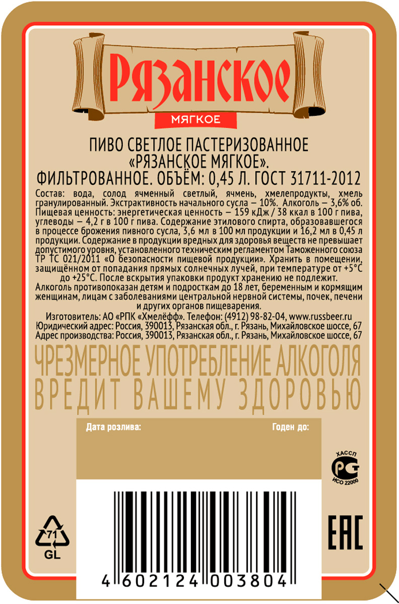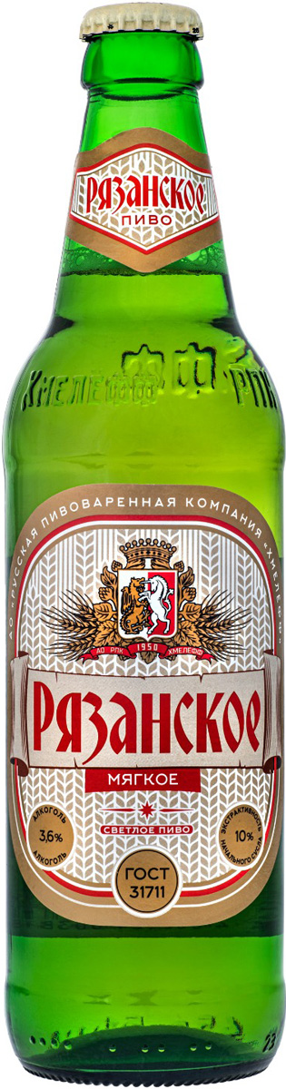 Пиво Рязанское мягкое светлое пастеризованное ст 0,45 л