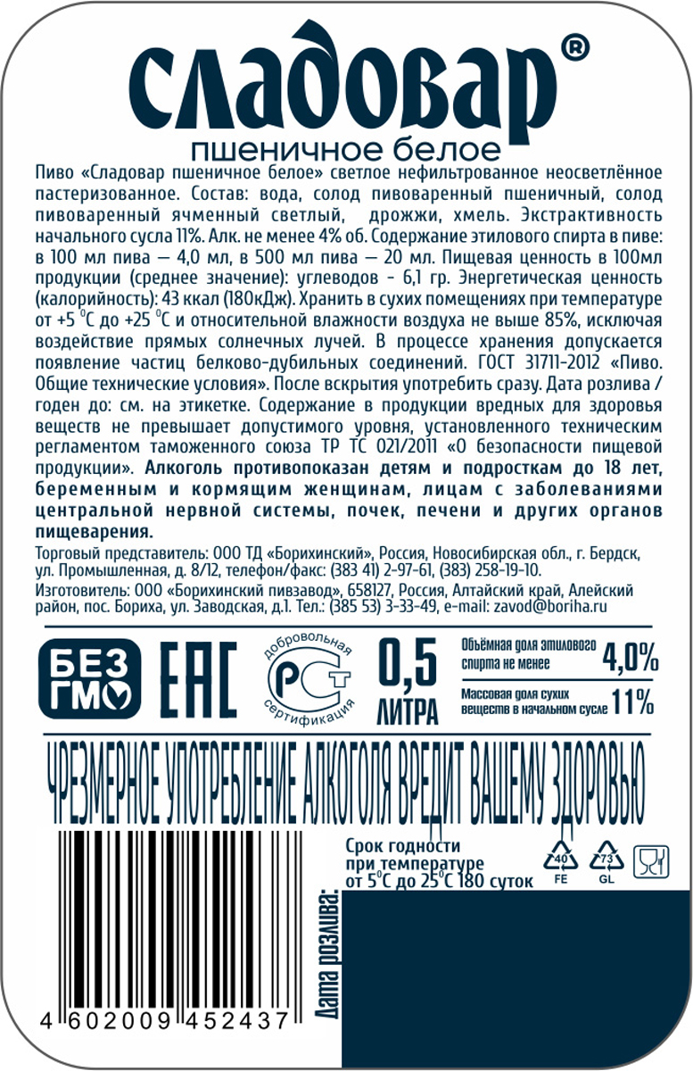 Сладовар пшеничное белое нефильтрованное