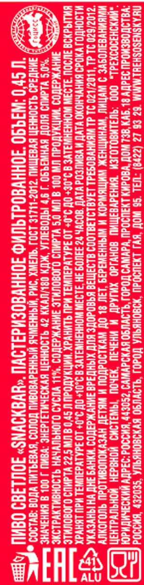 Пиво SnackBar светлое фильтрованное пастеризованное ж/б 0,45 л