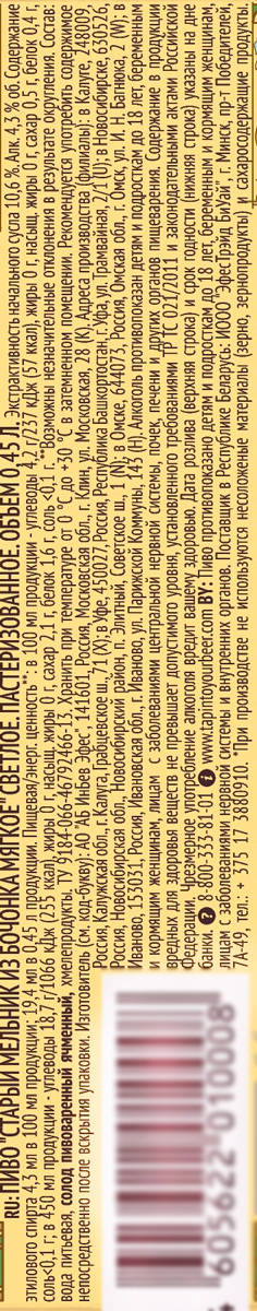Пиво Старый Мельник из Бочонка Мягкое светлое пастеризованное ж/б 0,45 л