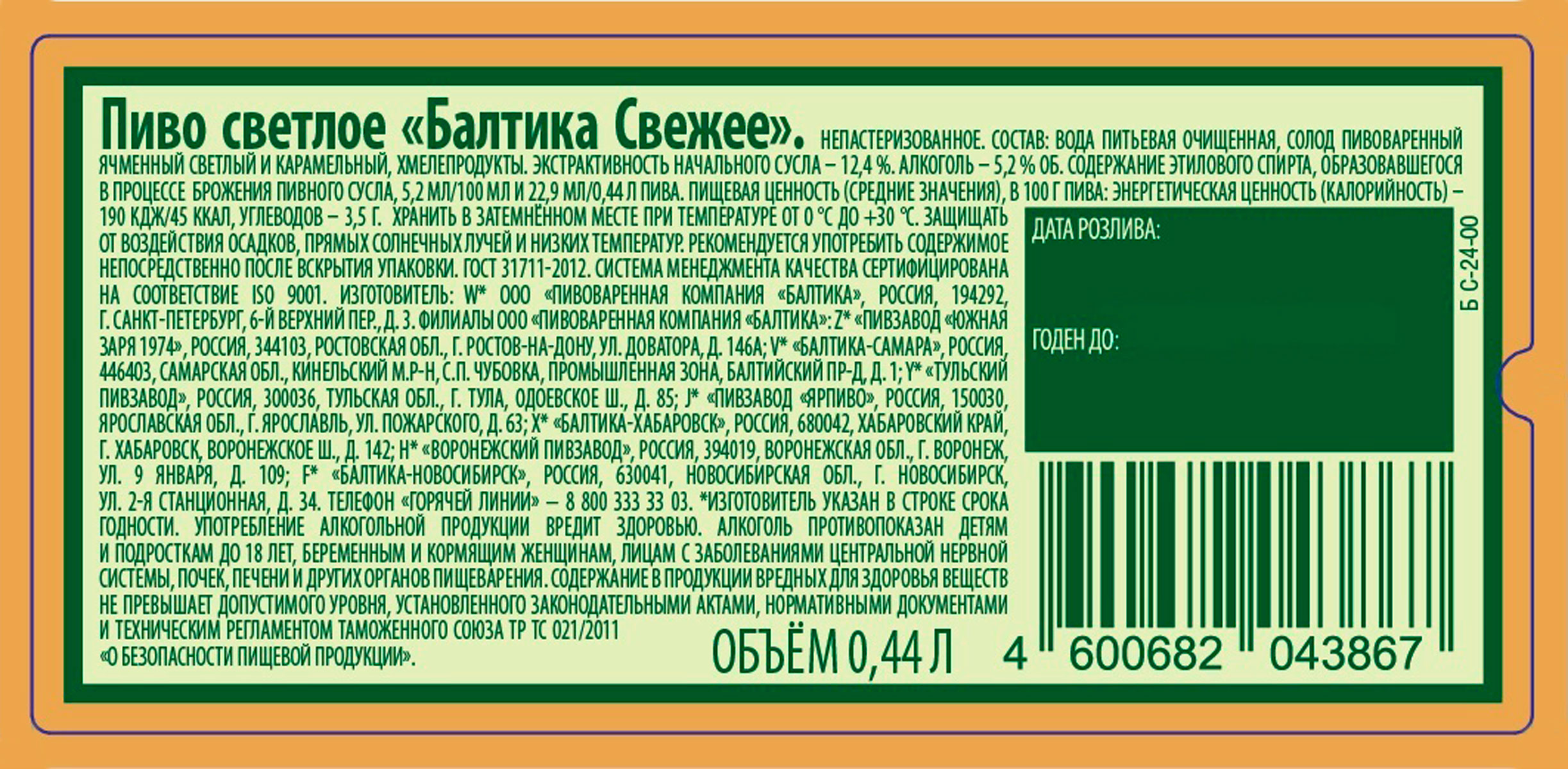 Пиво Балтика Свежее светлое непастеризованное ст 0,44 л