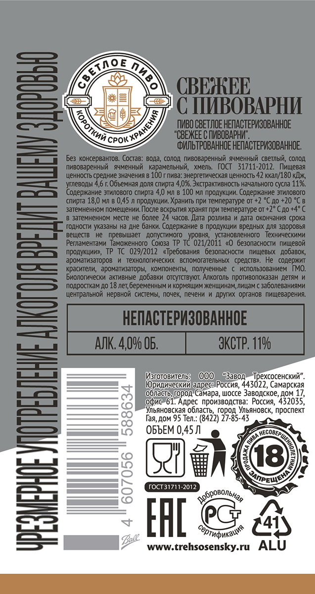 Пиво «Свежее с Пивоварни» приготовлено по уникальной рецептуре с использованием только отборного хмеля и солода. Короткий срок хранения и отсутствие пастеризации делают вкус этого свежего пива мягким, с легкой горчинкой хмеля в послевкусии.
