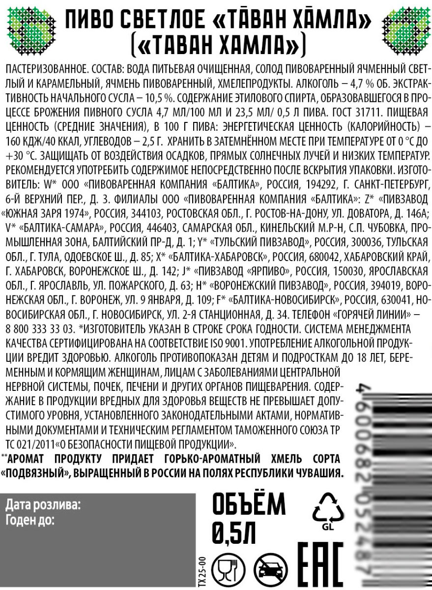 Пиво Таван Хамла светлое фильтрованное пастеризованное