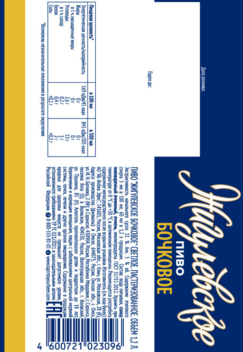 Пиво Жигулевское Бочковое светлое пастеризованное