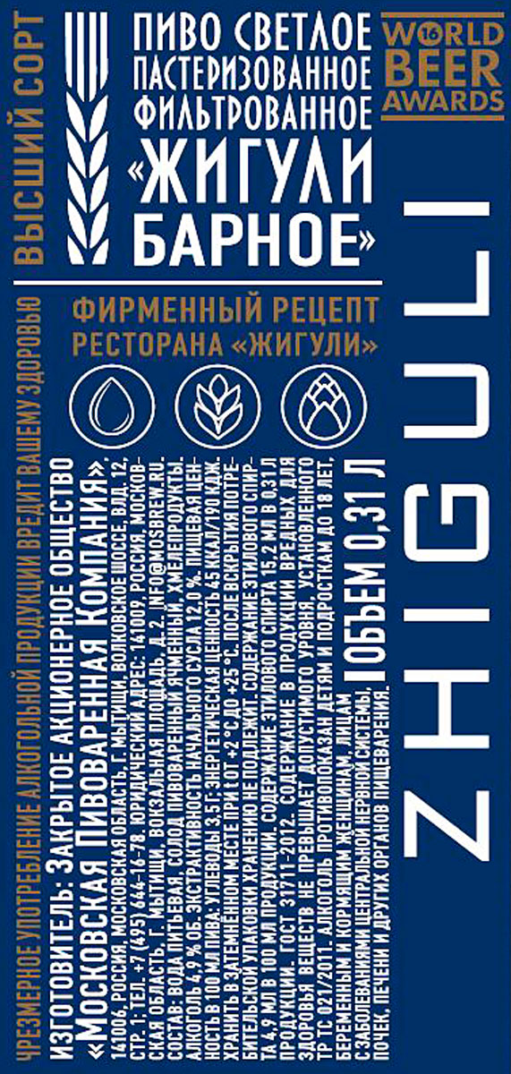 Пиво «Жигули Барное» варится по фирменному рецепту 1968 года. Пиво из легендарного московского ресторана «Жигули», воплотившее в себе лучшие традиции XX века. Отборный солод, тонко-ароматный жатецкий хмель и мягкая вода с глубины 320 метров придают пиву «Жигули Барное» индивидуальный, неповторимый вкус. Процесс брожения занимает 21 день, что позволяет сохранить уникальный аромат хмеля, придать пиву освежающую горчинку и полное солодовое «тело». Для любителей светлых лагеров.