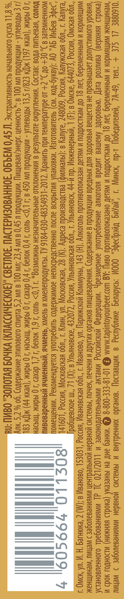 С 1999 года бренд «Золотая Бочка» предлагает оптимальный набор сортов качественного пива, отвечающих вкусам современных мужчин, которые знают толк в пиве. Этот сорт создан для того, чтобы ощутить чуть больше глубины вкуса и терпкости. Сварен по классическому рецепту, содержит очищенную питьевую воду, светлый ячменный солод и элитные сорта хмеля. Пиво с янтарно-золотистым цветом, терпким вкусом с легкой горчинкой и несравненным ароматом. Идеально сочетается со снеками, сырами, блюдами из мяса и рыбы.