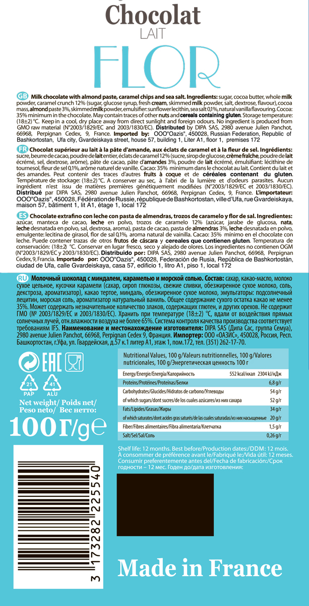 Шоколад Флор молочный с миндалем карамелью и морской солью