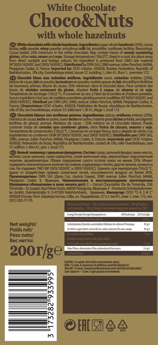 Шоколад Чоко энд Натс белый с цельным фундуком