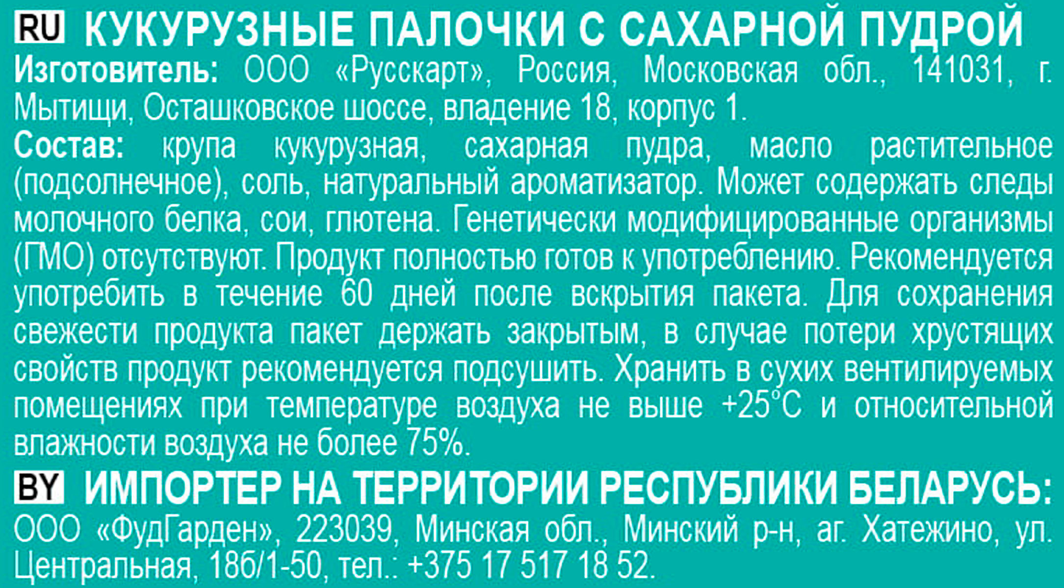 Сладкие воздушные кукурузные палочки «Кузя Лакомкин» приготовлены из отборного отечественного сырья: кукурузы, подсолнечного масла и сахарной пудры. Палочки нежно хрустят и просто тают во рту. Любимый продукт детей и взрослых!
