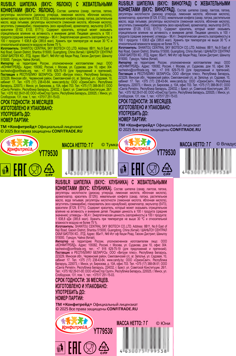 Шипелка с жевательной конфетой – это взрывное сочетание вкусов! Знакомый продукт в неожиданном формате. Мягкие жевательные конфеты с кислинкой и взрывающаяся карамель, которая сопровождает сладким шипучим эффектом. Выбери свой любимый вкус: виноград, яблоко или клубника!