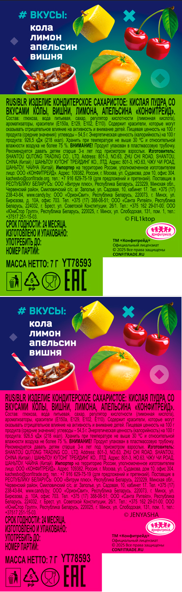 Сахарная пудра с кислым вкусом в форме трубочек. Мелкая, воздушная пудра мгновенно тает во рту, а приятная кислинка делает вкус ярким и запоминающимся. Идеально для детей и подростков, весёлых компаний и праздников.