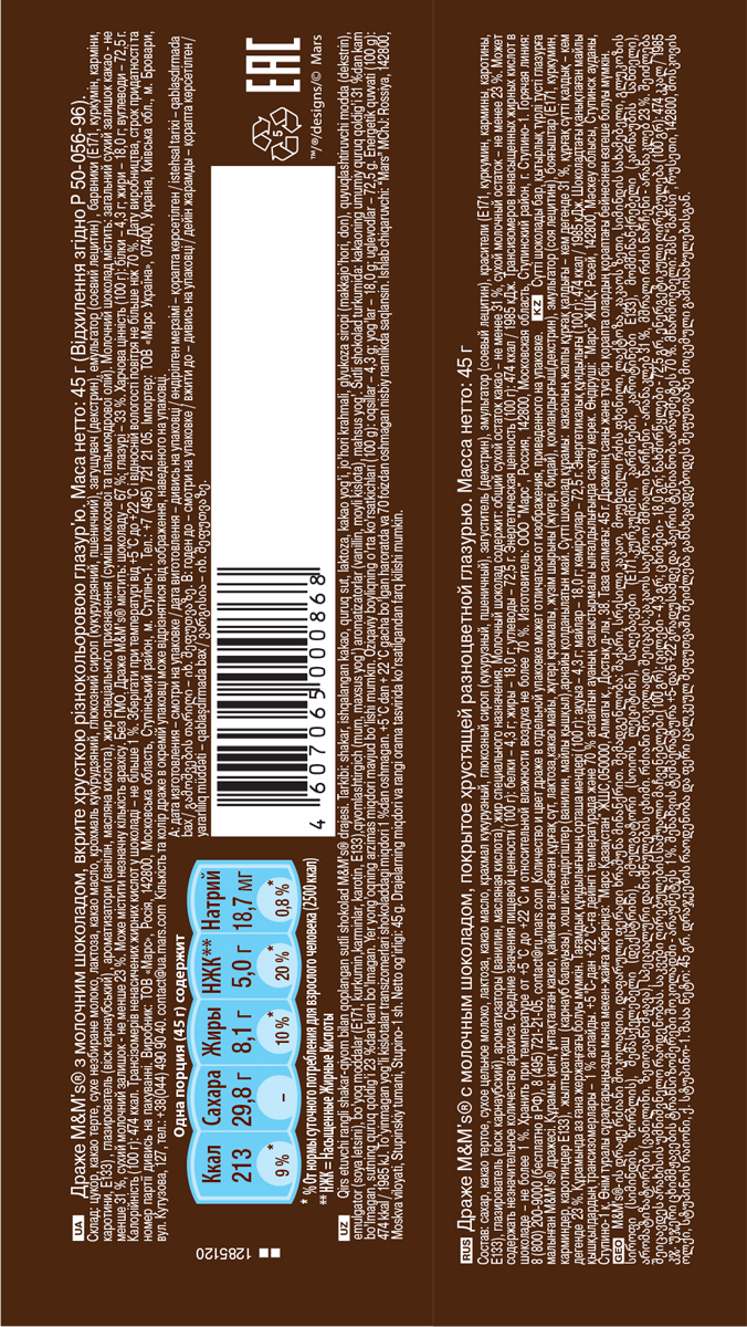 Эти шоколадные конфеты в яркой глазури давно стали всемирно известным и любимым брендом. Драже M&M's с молочным шоколадом, покрытое хрустящей разноцветной глазурью, порадует всех любителей шоколада и ярких впечатлений!