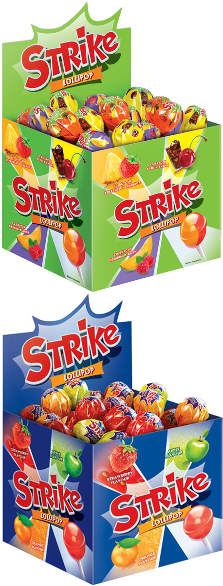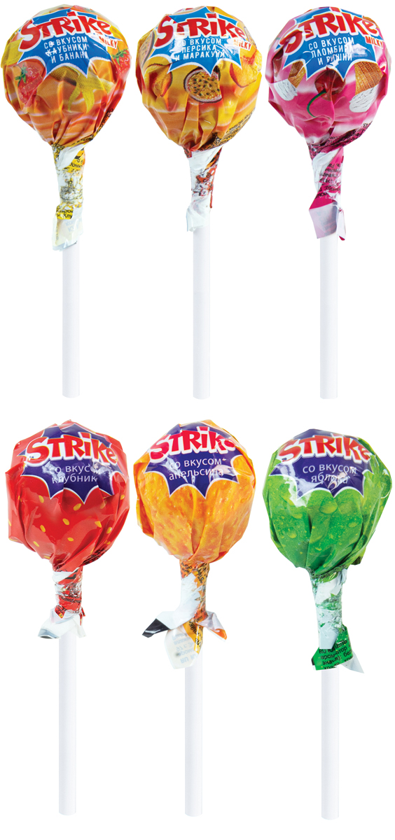 В ассортименте карамель на палочке с добавлением молока и фруктовыми вкусами: пломбир-вишня, персик-маракуйя, клубника-банан. Также используются молоко и натуральные красители.