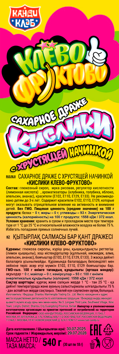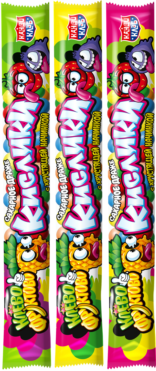 Сахарное драже с хрустящей начинкой. В упаковке — микс вкусов: клубника, голубика, яблоко, апельсин, ананас.