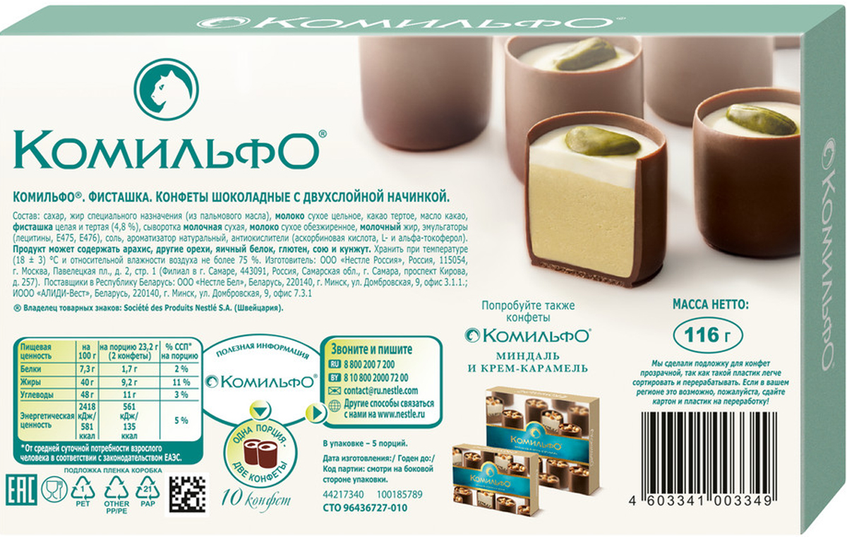 Гармоничное единение изящной формы и гениального содержания рождает неповторимый образ, где каждая конфета «Комильфо» — это сочетание нежной текстуры и нескольких слоев восхитительной начинки в тонком обрамлении превосходного шоколада. Попробуйте шоколадные конфеты «Комильфо» с двухслойной начинкой с фисташкой. Конфеты «Комильфо» — прекрасный выбор для подарка дорогим людям, а также отличный способ побаловать себя безупречным вкусом и высоким качеством.