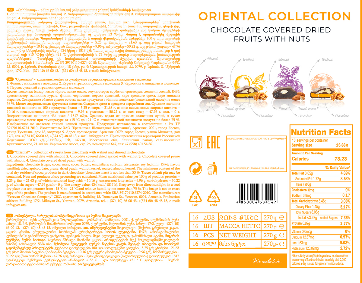 Подарочный набор сухофруктов в темном шоколаде «Марк Севуни Ориенталь». Восхитительные фрукты, выращенные в сердце Армении — Араратской долине, высушенные на солнце и впитавшие его тепло, в сочетании с орехами и покрытые нежным темным шоколадом. Абрикос, финик, персик, чернослив.
