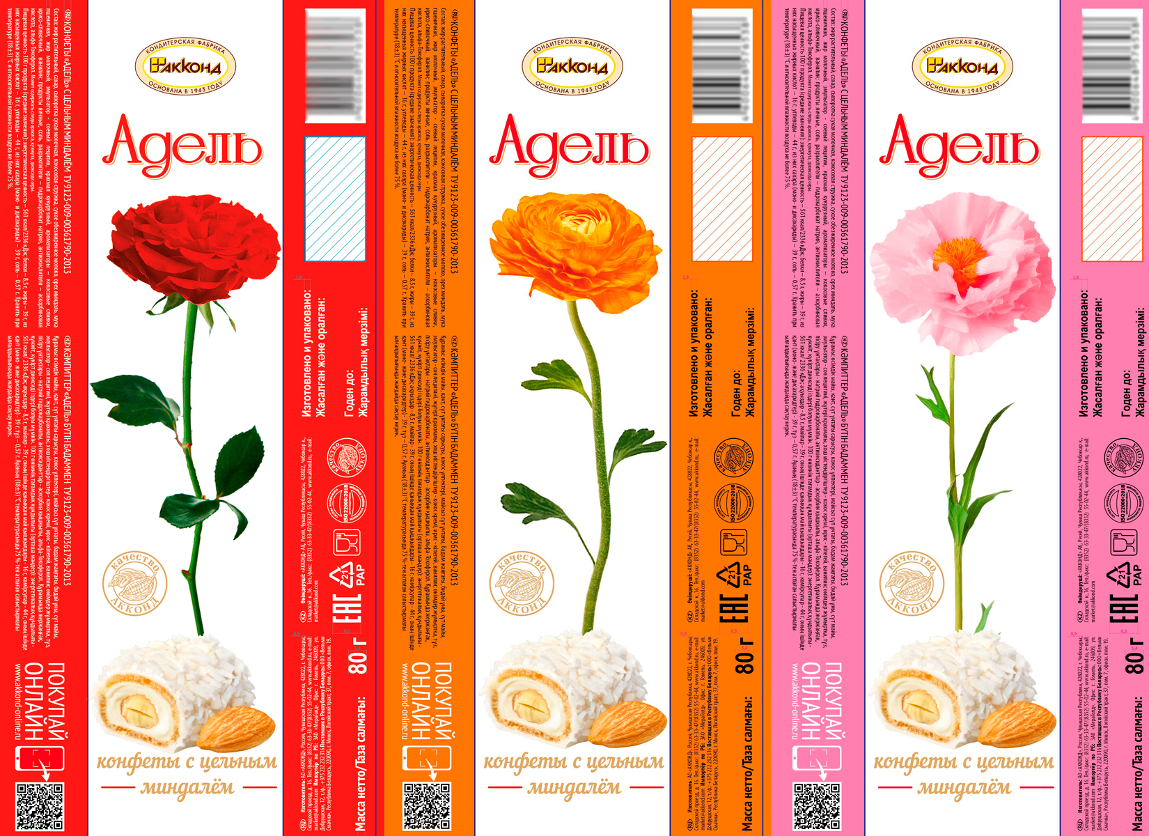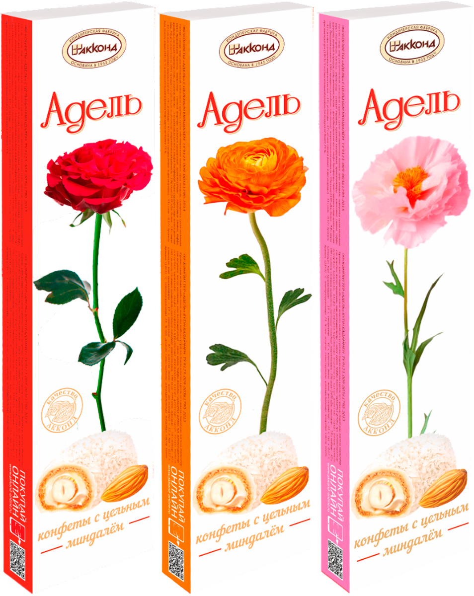 «Адель» с цельным миндалем — конфеты в вафельном корпусе с обсыпкой кокосовой стружки в белой глазури на основе кремовой начинки с вложением цельного ореха миндаля.