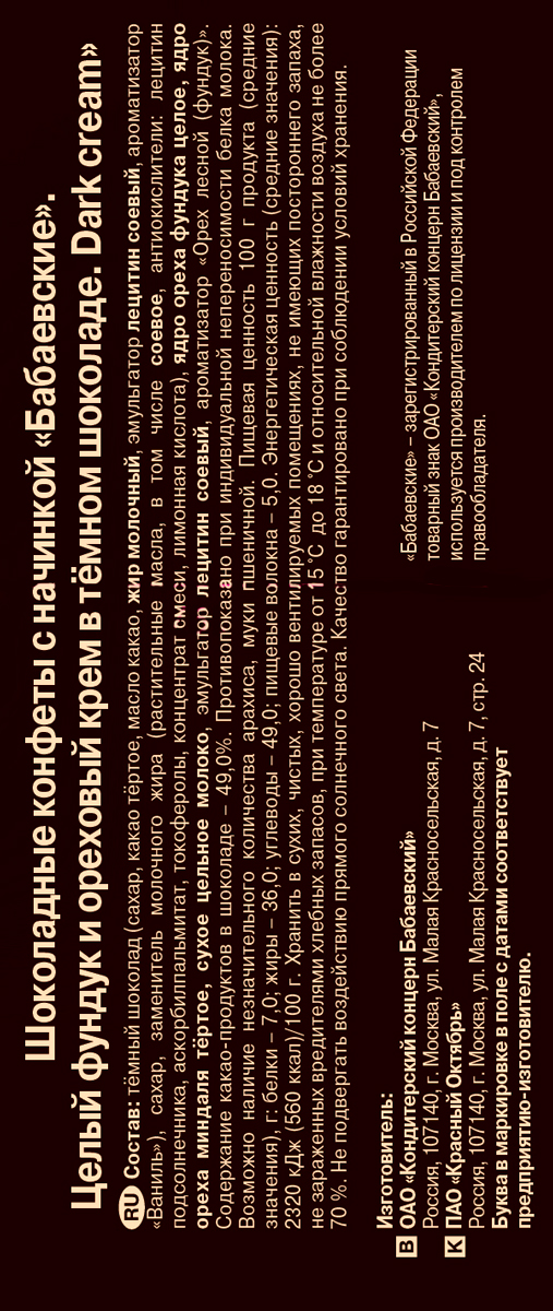 Мягкий, тающий, нежный крем и цельный лесной орех – гармоничное сочетание, заключенное в неизменно бархатный благородный темный шоколад «Бабаевский». Выразительный, элегантный вкус этих конфет доставит истинное удовольствие шоколадным гурманам!
