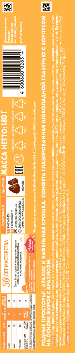Попробуйте конфеты «Родные Просторы» с нежной начинкой из арахиса, покрытые шоколадной глазурью и вафельной крошкой.