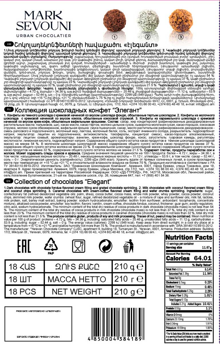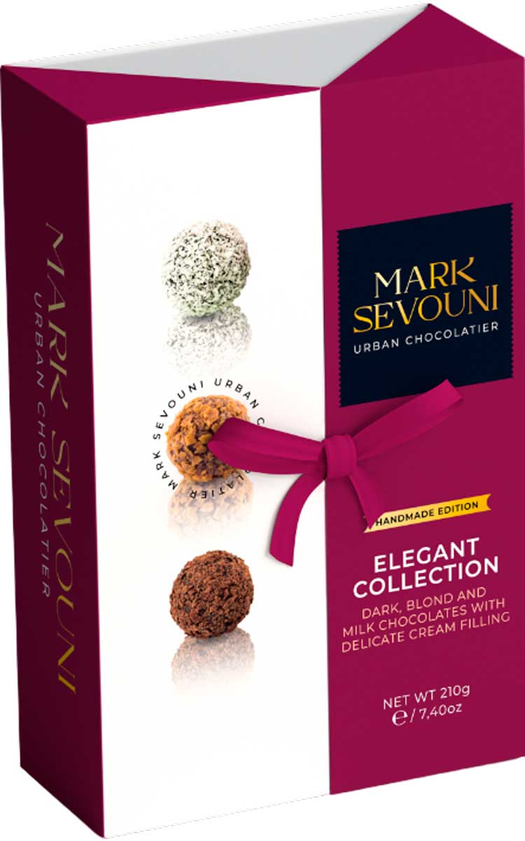 Изысканный набор роскошных шоколадных трюфелей ручной работы «Марк Севуни Элегант». Коллекция включает 3 вида трюфелей с нежными кремовыми начинками, обсыпанными шоколадной, кокосовой стружкой и крошкой из бельгийских вафель. Благодарая оригинальной упаковке этот набор станет отличным подарком для любого повода.