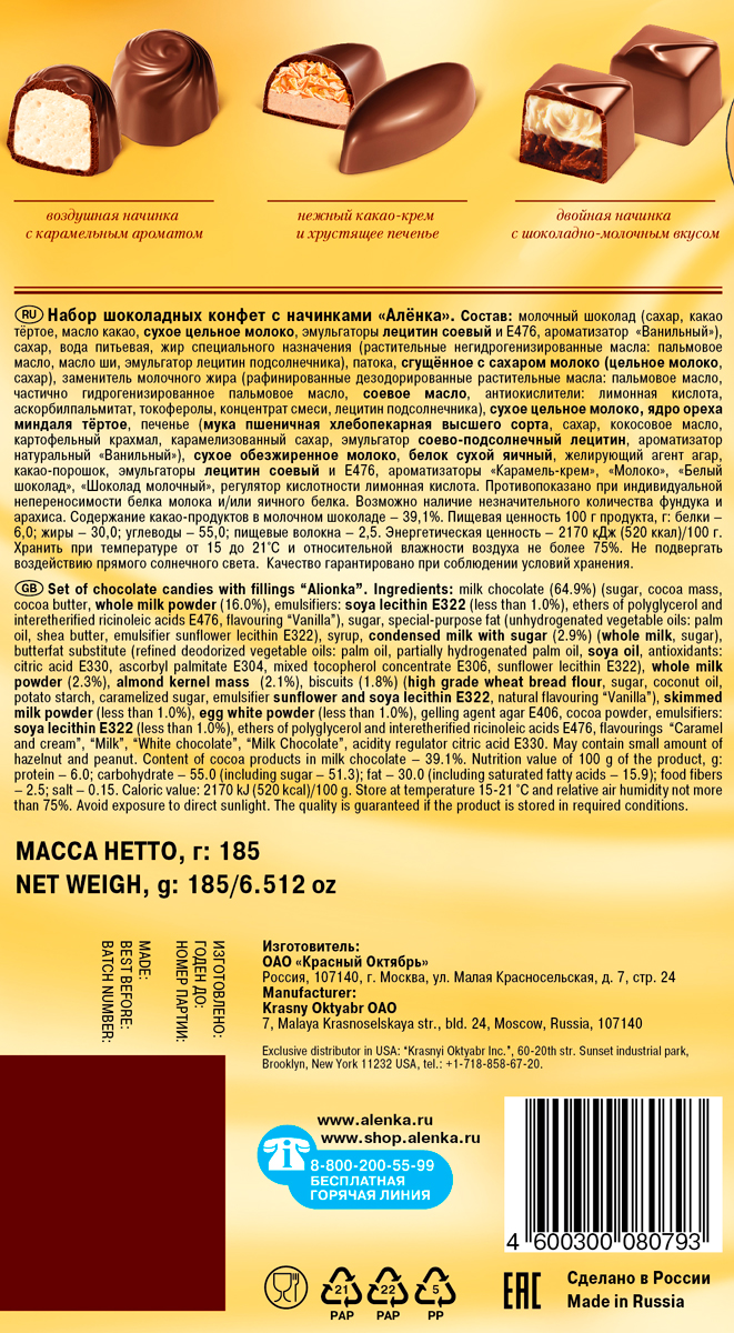 Набор конфет из любимого молочного шоколада с разными начинками: двойная начинка с шоколадно-молочным вкусом, воздушная начинка с карамельным ароматом и 100% хит — нежный какао-крем и хрустящее печенье.