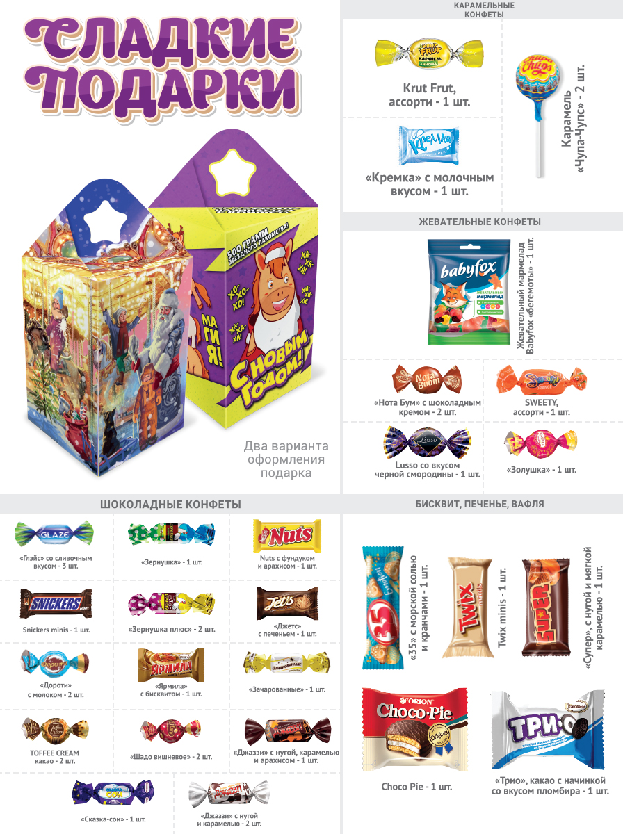 Целых 500 граммов шоколадных и жевательных конфет, бисквитов, печенья и вафелек ждут вас в новогоднем подарке «Звездное лакомство»! Также сладкий подарок понравится и взрослым, которые любят пить чай или кофе с конфетками.