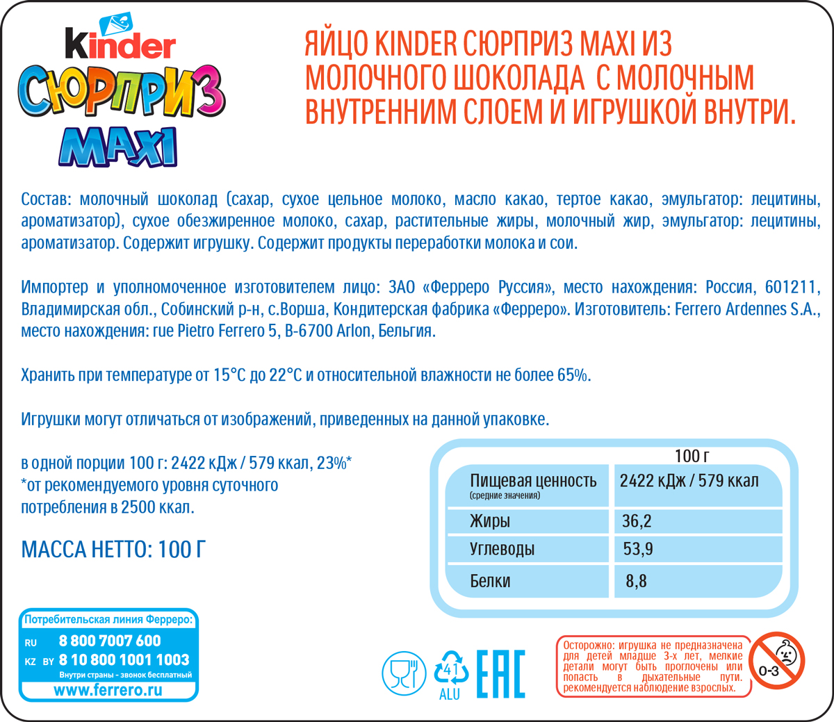 Kinder Сюрприз MAXI — специальная серия привычных яиц из молочного шоколада самого высокого качества с игрушкой-сюрпризом внутри. Изготовлен специально для детей и содержит много молока, а новый большой формат (целых 100 граммов удовольствия!) не оставит равнодушным никого. Подарите вашему ребенку сказку вместе с Kinder Сюрприз MAXI!