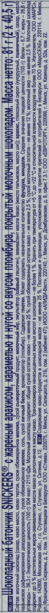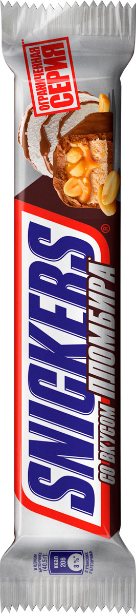 Потрясающе вкусный шоколадный батончик Snickers с жареным арахисом, карамелью и нугой со вкусом пломбира, покрытый молочным шоколадом. Сладость, которую можно взять с собой в дорогу на любой случай, когда нужно вкусно зарядиться энергией. Идеален вместе с горячими напитками или под просмотр хорошего фильма.