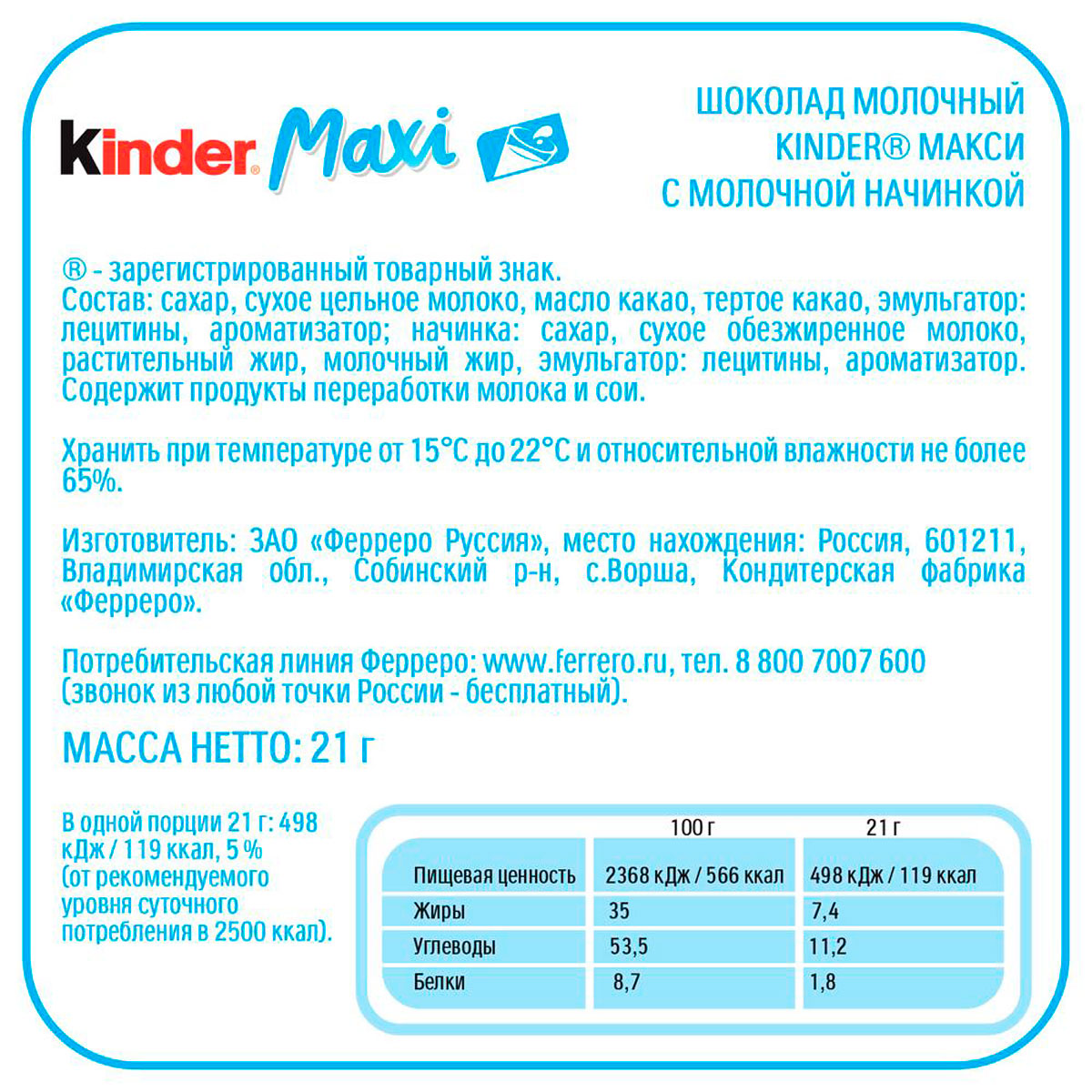 Шоколад Киндер Макси с молочной начинкой 21 г