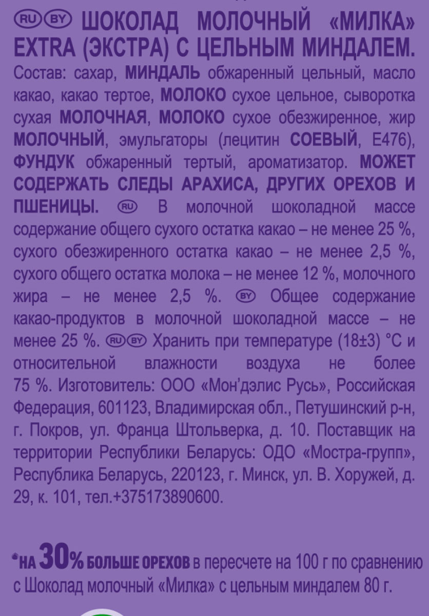 Шоколад Милка Экстра молочный с цельным миндалем 140 г