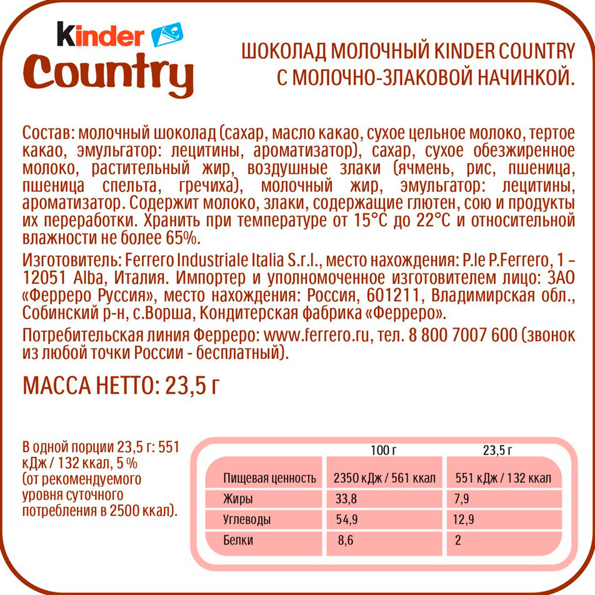 Шоколад молочный Kinder Country с молочно злаковой начинкой 23,5 г