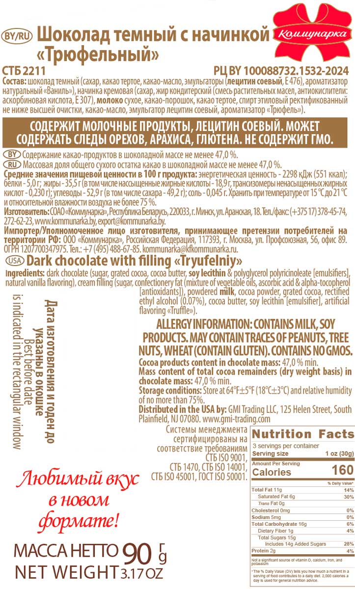 Шоколад Трюфельный тёмный с начинкой 90 г