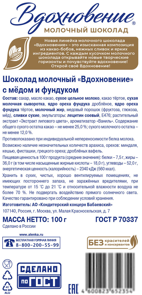 Шоколад Вдохновение молочный с медом и фундуком 100 г